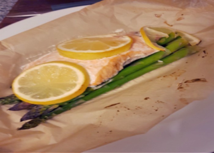 Wrap up the day by sitting down to heart-healthy piece of Salmon “en papillote,”. This is just a fancy way of explaining a cooking method that happens to be so simple. It’s pretty much a fool proof way of cooking fish and veg. Cook each portion of fish in its own paper packet. This recipe for Parchment Paper Baked Salmon with Asparagus and Lemon will only produce moist delicious salmon! I love this cooking technique because you can prepare these little packets ahead of time. So if you know you will be tight for time one evening, prep the packets the night before and bung them in the oven when you get home. Voilla…Beautiful fish 17 minutes later.