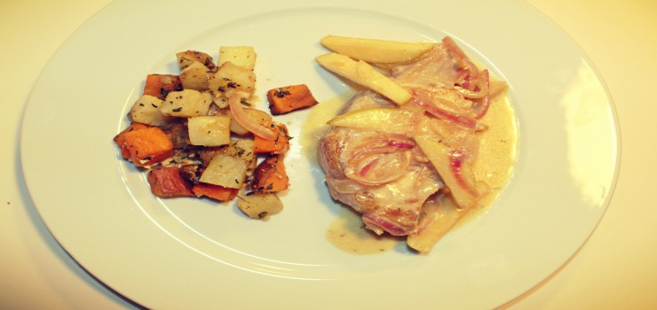 - Serve the chops with squares of sweet potato and regular potatoes, spooning the apple-onion mixture over the top.