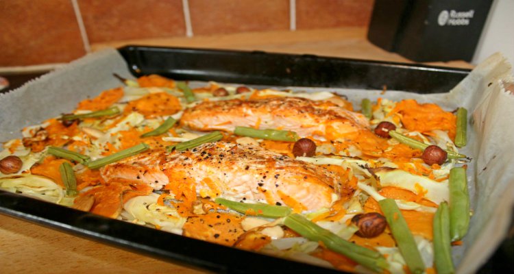 - Spread the mix on the baking tray and place the salmon fillets (skin side down) ontop of the mix