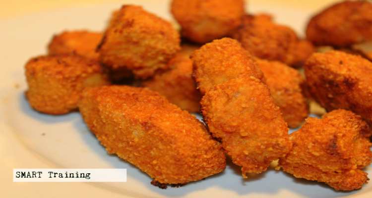 - Dip the chicken pieces into the egg firstly and then the almond mixture. Ensure the chicken is covered in the almond crumb. Then place on a lined baking tray.