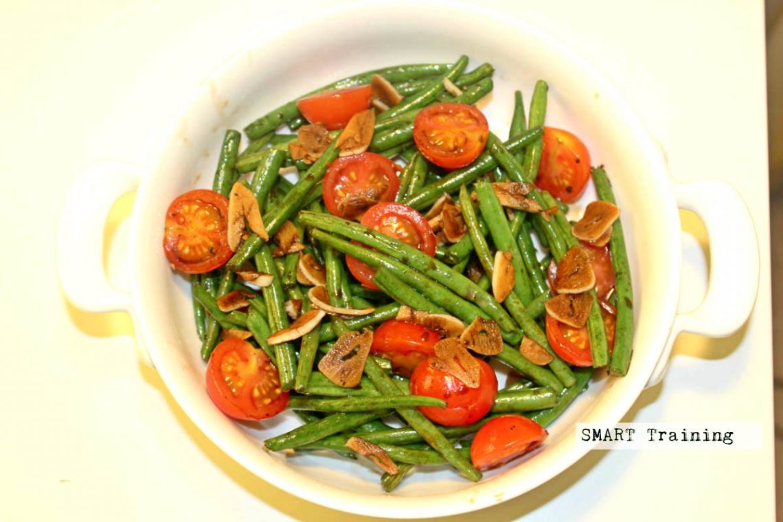 - Add some olive oil to a saucepan and heat over a medium heat. Add the garlic and saute for a minute. Then add the green beans and cherry tomatoes, aswell as some salt and pepper. Heat for 4-6 minutes and remove from the heat once the tomatoes start to blister. Stir in the balsamic and serve immediately.