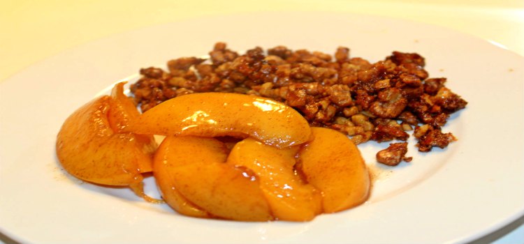 This desert of Cinnamon Stewed Peaches with Walnut Crunch takes 15 minutes to make and is so delicious. The soft stewed cinnamon-spciced peach with the hard crunch of the Walnuts is such a satisfying combination.